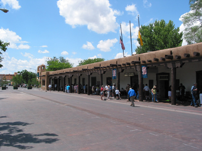 Santa Fe is a unique American City. All the buildings in this city maintain the earth tones and style of the original adobe even when using other building materials. Even the State Capital building is not a copy of the U.S. Congress as are all other State capitals. It is a round building, it does have a few columns but it is only one story and its rotunda is a sky light and the entire building is in earth tones and not white. Outside the State Capital and on loan from the Artist, Bob Haozousis a memorial to the Native American Tribes that have been destroyed or otherwise went extinct since Europeans came to this continent. He calles it "Gate/Negate 2000" (the picture does not adequetly portray the names but the barrier is covered with names)