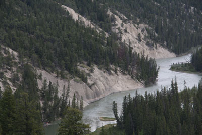 On Wednesday June 17th we hiked down to the Bow River trail and into town. While hiking it started to rain so we stopped to put on rain coats. When we got to town the rain had tapered off so we walked along the river to the Bow River Falls which aren't really falls. It is maybe a 100 foot drop which takes 100 to 200 hundred yards to occur. I couldn't get official measurements so that's my best guess. People come by foot, car and bus to see the last part of the drop about 25 ft. It's not a very impressive falls but the river with it's surrounding mountains and shore are quite scenic. While we were there a bus load of Americans I assume since the bus had Oregon plates came, got off the bus took a few pictures and hurried back to the bus shivering and it really wasn't cold although Debby and I had sweat shirts on .Unfortunately that's the way most people even some that rent class C motor homes see the parks both here in Canada and in the United States as well. The car and bus crowd that stops in parking lots and along the roads outnumbers those that hike and bike through the parks. A representative for Banff tourism told Debby that she has seen statistics that 95 % of the visitors to the US National Parks don't go very far from their cars buses or parking lots. They jump out take their pictures and jump back in. Having seen this elsewhere I can well believe it but believe me they are missing a hell of a lot. We miss a hell of a lot even though we do get out and hike away from the usual tourist sights.