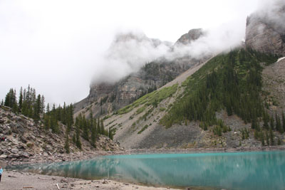On Sunday June 21st we went to Poppy's in the Fairmont Lake Louise Hotel and had a buffet breakfast. After the meal we went up to the lobby and had a very nice conversation with the Assistant Front Office manager. I was interested in learning what happened to the metal mirror sphere that was outside facing the lake the last time we were there. It seems it fell into disrepair and removed. I had hoped to take some pictures with my telephoto lens as the camera I had in 2003 didn't have an adequate lens for the purpose. From the Fairmont we drove over to Moraine Lake and walked to the end of the lake about a mile.