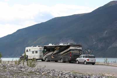The next morning we left Watson Lake and drove down to Liard River Hot Springs. On the way down I had my first and only flat tire of the trip. It had nothing to do with the roads and was due to my own carelessness. While in Danali National Park I made a left turn and hit my left front trailer tire on a traffic island. evidently I had done more damage then I realized although it lasted over a month and several hundred miles before the tire separated. We have a Pressure Pro tire monitoring system so we knew immediately that we had a flat. We pulled over although there wasn't a lot of room on the shoulder. Our friends not realizing we were in trouble continued to Laird where we met them several hours later. Luckily a passing motorist, a Yukon resident heading in the opposite direction stopped. With his help I was able to change the tire and put air into the spare with my on board generator and we continued on our way. At Liard Debby , Marci and Steve took in the hot springs while I remained at the trailer reading as my blood pressure was running a little high.